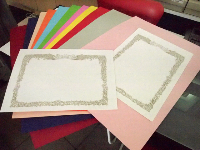 (全紙)、白ボール紙(全紙)、画用紙、賞状など、各種用紙を