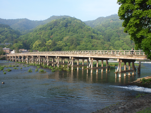 嵐山の桂川に架かる全長250mの橋。渡月橋の南にそびえる標高375mの「嵐山」は春の桜、秋の紅葉の美しさで有名で、渡月橋は嵐山地区の景観を代表する橋と言えるでしょう。桂川はこの渡月橋を境に、上流は大堰川あるいは保津川と呼ばれることもあります。