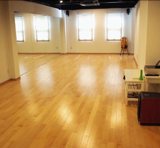 フローリング、鏡張り、音響完備のダンススタジオ。